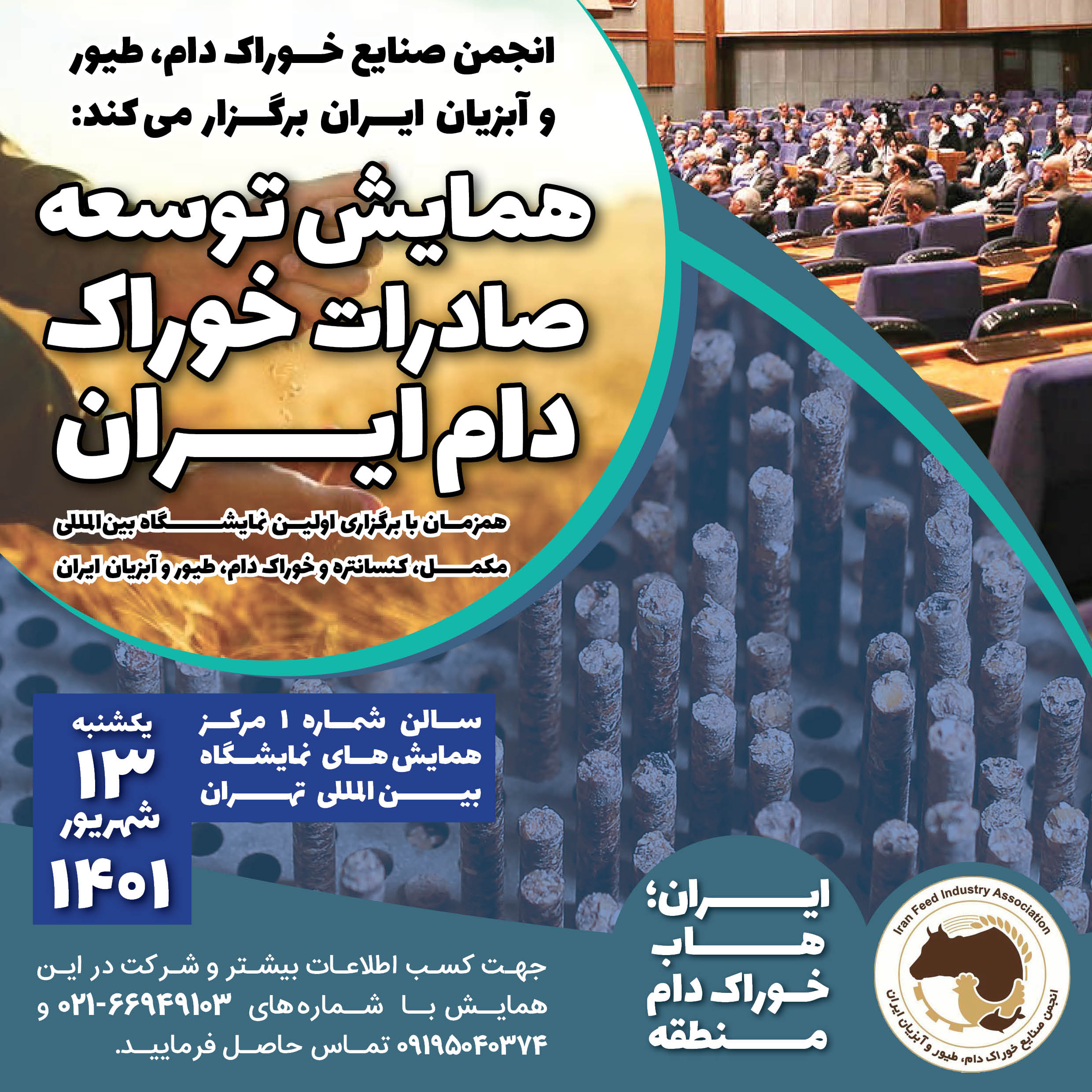اولین نمایشــــــــگاه بینالمللی مکمــــل، کنسانتره و خوراک دام، طیور و آبزیان ایران 12 الی 15 شهریور 1401 محل دائمی نمایشگاه های بین المللی تهران