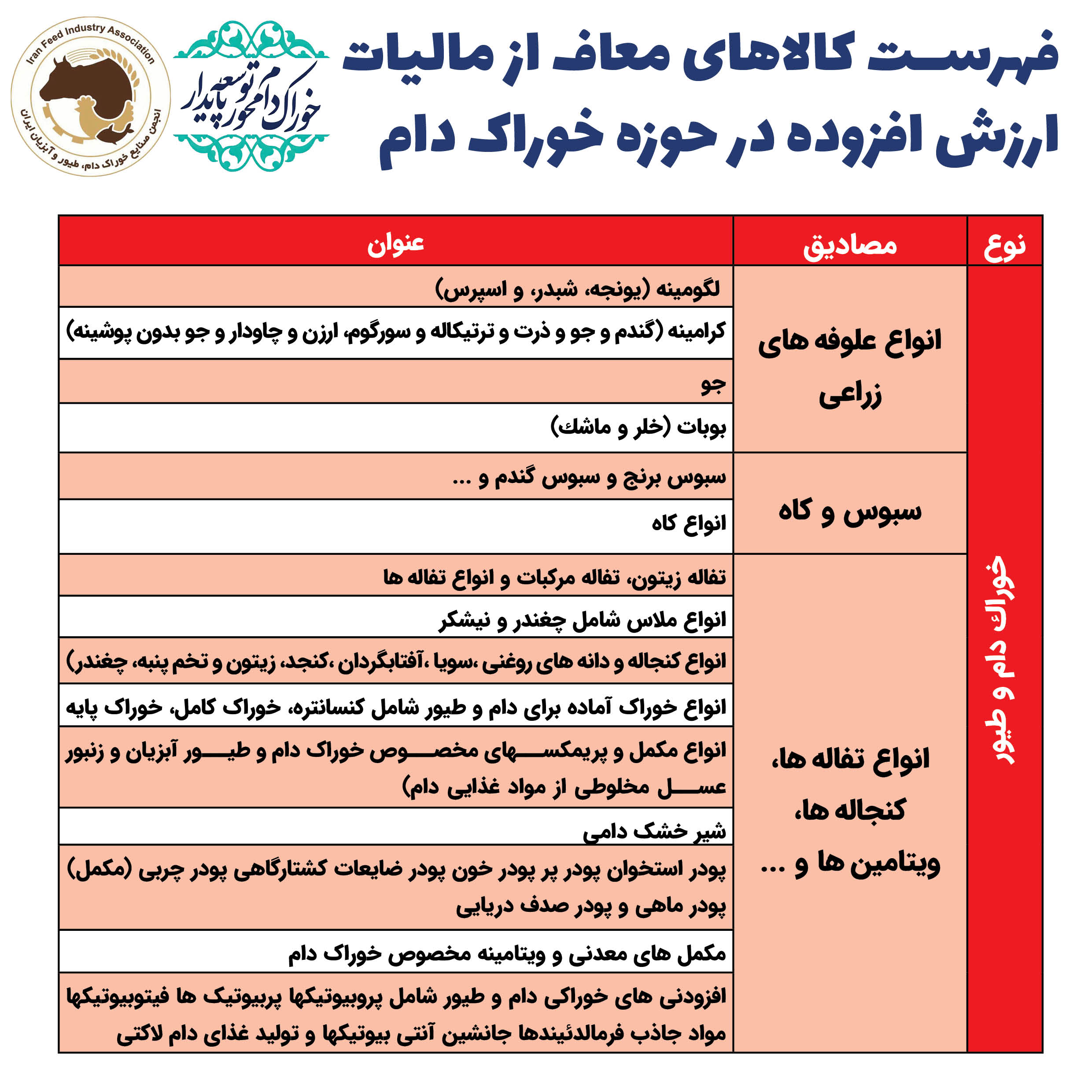فهرســت کالاهای معاف از مالیات بر ارزش افزوده در حوزه خوراک دام