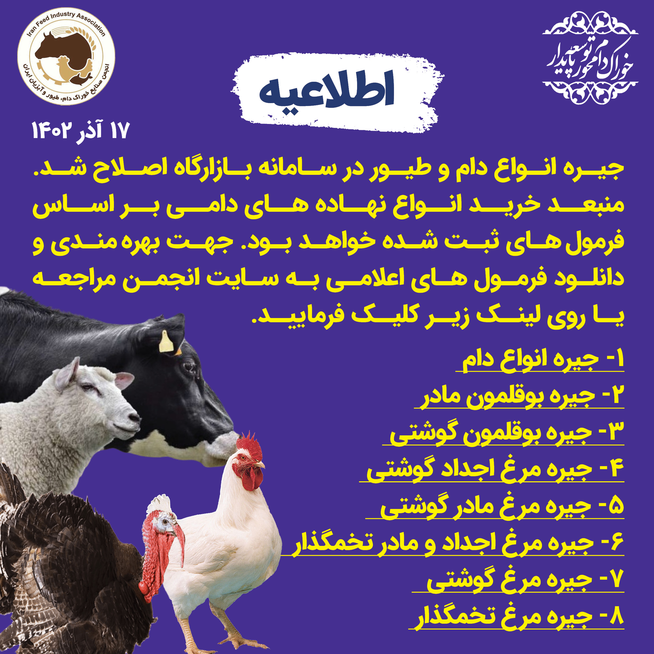 جیره انواع دام و طیور در سامانه بازارگاه (17 آذر 1402)